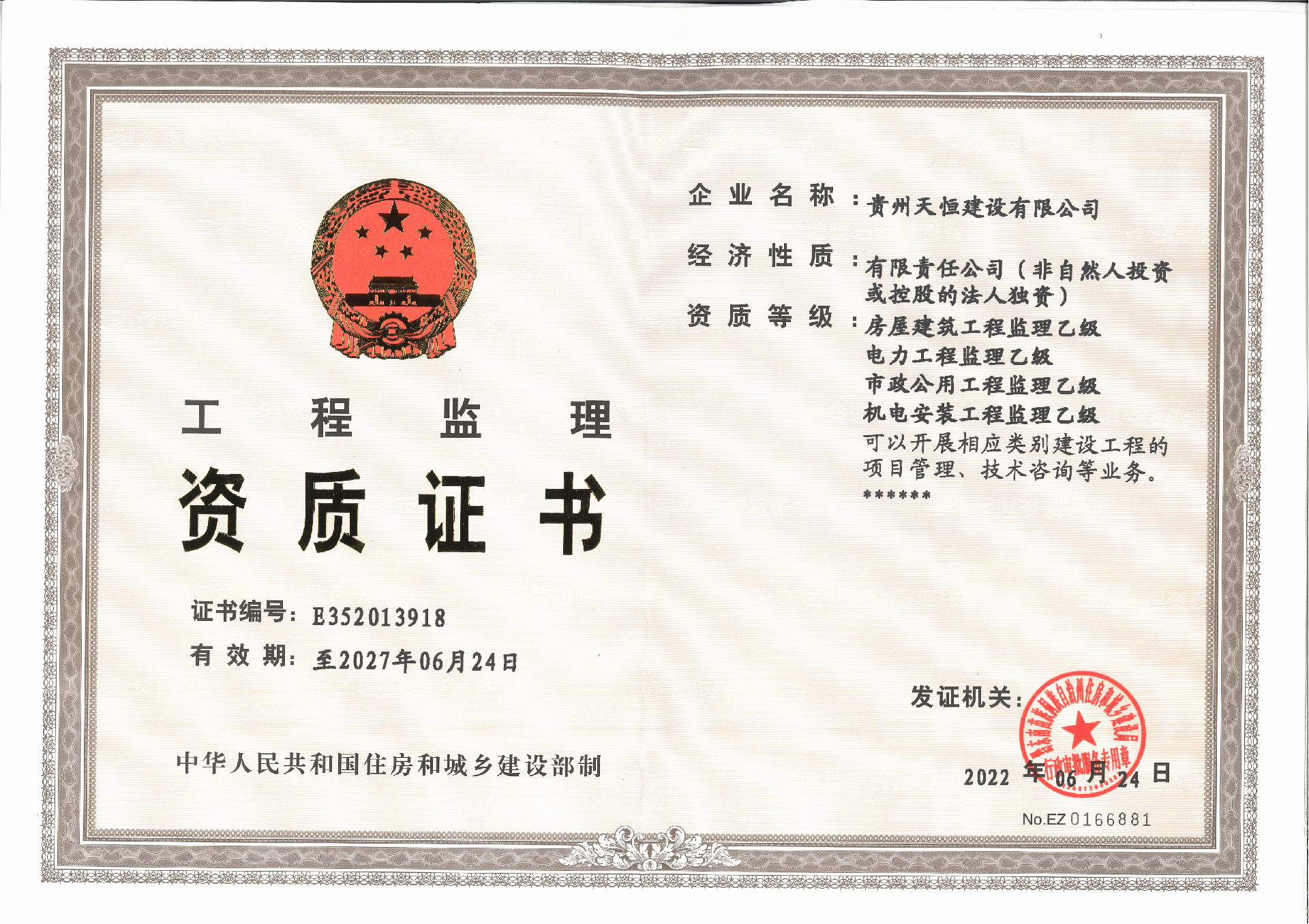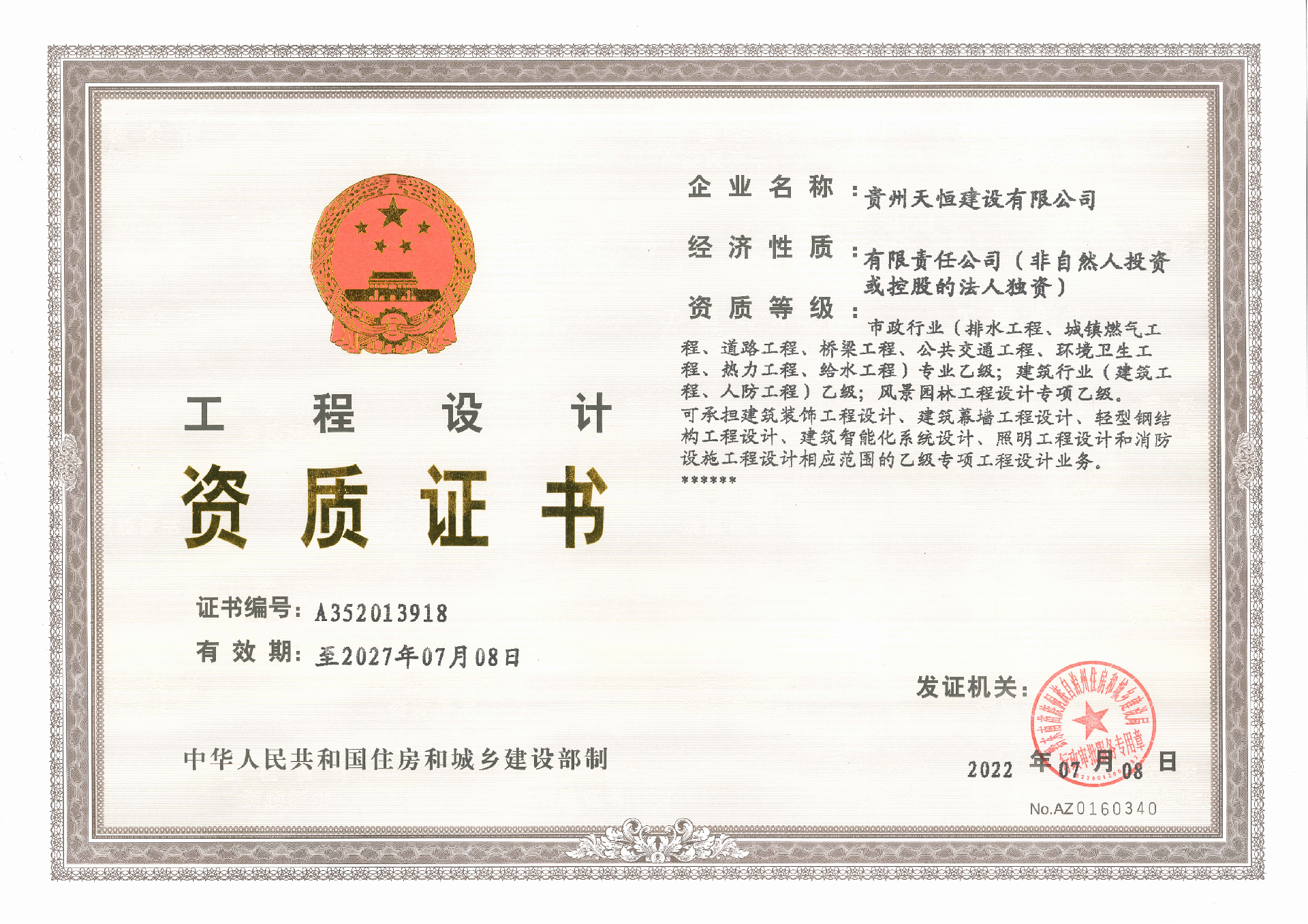 貴州天恒建設有限公司證書